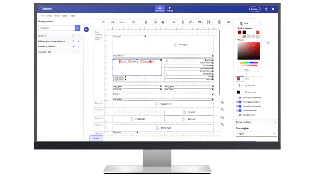 Comarch sPrint to nowoczesne narzędzie do obsługi wydruków w systemach ERP, które pozwala tworzyć i personalizować dokumenty w formie elektronicznej. Dzięki intuicyjnemu Edytorowi użytkownicy mogą łatwo projektować własne szablony, korzystając z szerokich możliwości formatowania tekstu, zarządzania sekcjami czy dodawania tabel, obrazów, kodów kreskowych i QR. Dla bardziej zaawansowanych potrzeb dostępne są funkcje takie jak miary wyliczane, grupowanie danych, osadzanie podszablonów czy widoczność warunkowa, co sprawia, że sPrint pozwala tworzyć spersonalizowane wydruki.